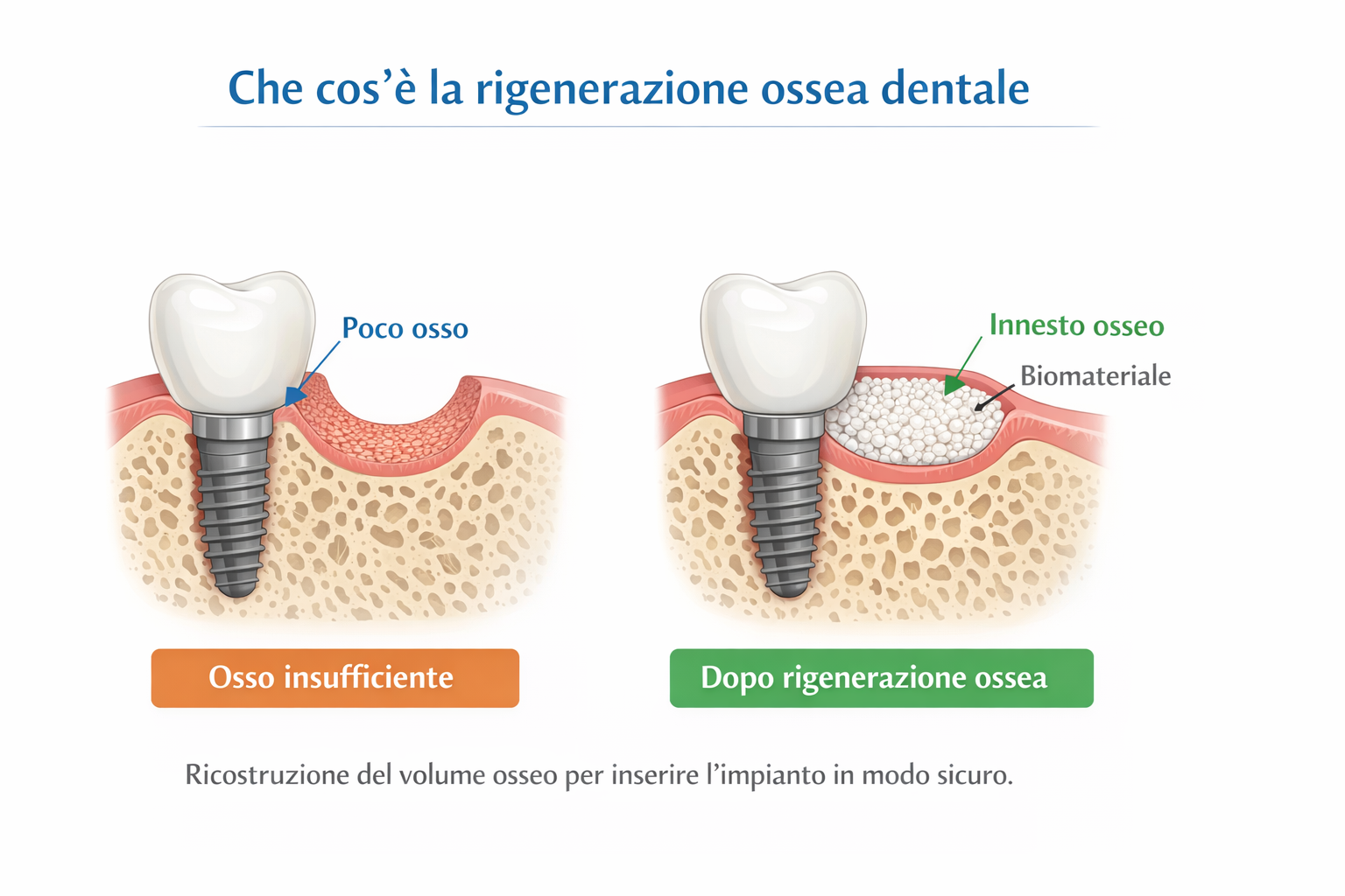 La rigenerazione ossea non è necessaria in tutti i casi. Serve quando la quantità o la qualità dell’osso presente non è sufficiente per inserire l’impianto in modo stabile, corretto e predicibile.